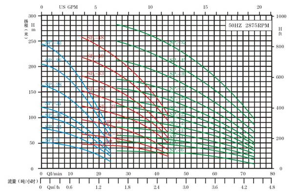 SP全不銹鋼深井泵使用高效率的水力模型設計葉輪,節(jié)約了運行成本。電機和水泵垂直連接,僅需要較小的安裝空間。在泵體上方裝有止回閥,可防止斷電時水泵受到水的沖擊。可根據不同的流量和揚程要求,靈活組裝水泵的零部件。泵體和電機均采用不銹鋼材料制成,具有較好的防腐蝕性,且不會造成二次污染。由于泵體置于水中,因此產生的噪音很低。提供了適應不同電壓(380V/220V)和(50HZ/60HZ)的一系列不銹鋼水泵。0.5-380m3/H,最大電機率185KW。不銹鋼意味著水泵重量輕,搬運方便,裝配成本低,大大節(jié)約安裝和維修成本。所有軸承均是水潤滑,長方形狀軸承通道使得存在的沙粒可以隨抽取液體同時排出。